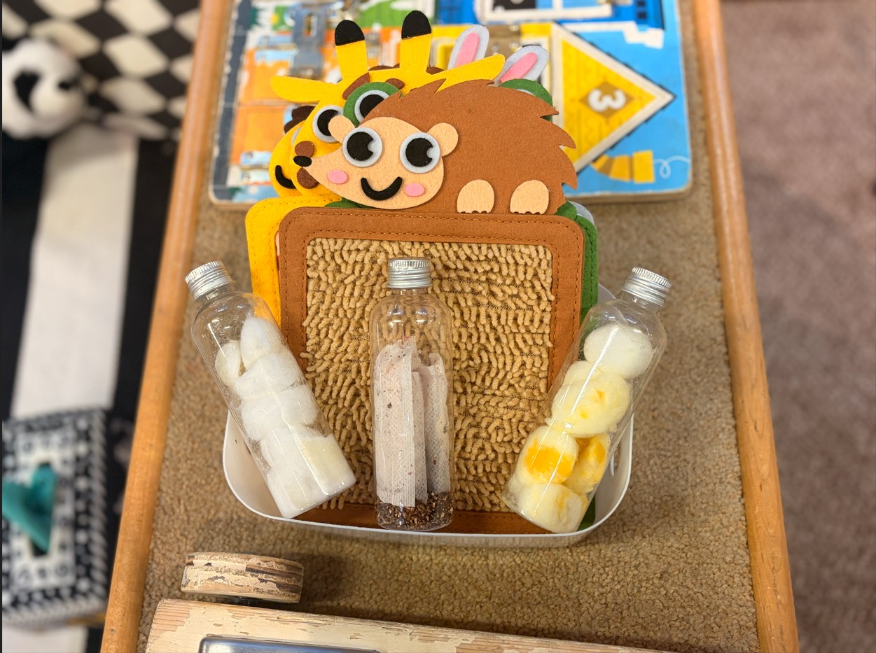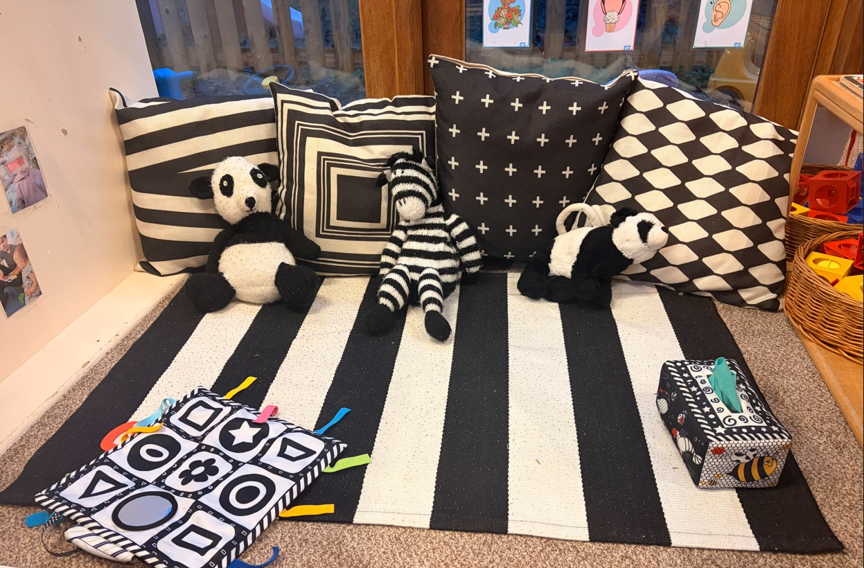 Smaller babies can benefit from time spent in their own sectioned area of the room. with Black and white resources/pictures, babies can grow their focus and attention, develop their optic nerves and teach their eye muscles to coordinate with their brains. There is also opportunity for tummy time and smaller group work.